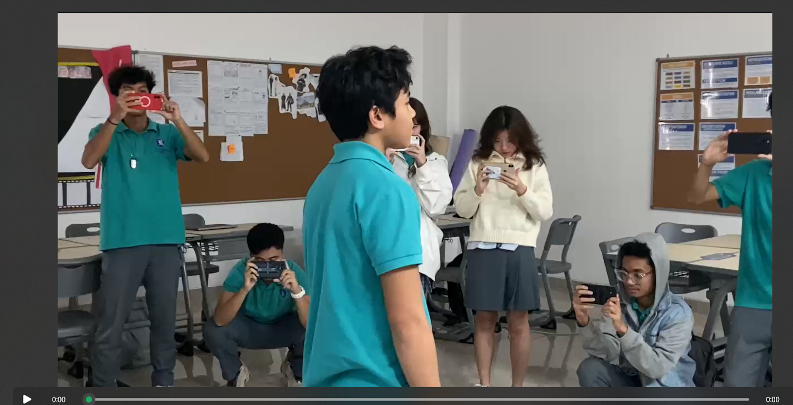 Our subject , a classmate, stood in the centre of the room and did a short performance. My group stood around the subject to record the performance from different angles. You can also see members from other groups because we did this lesson as a class. To make it easier to synchronise our cameras, the teacher clapped at the start of the scene. This allowed us to line up the video in the editing process and ensure that the transitions would be smooth. Without this simple action it would have taken a lot longer to sync the videos.